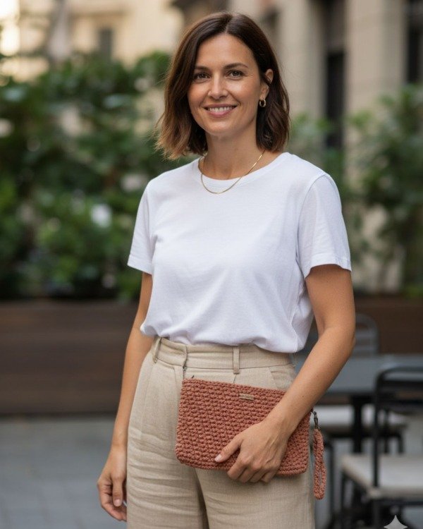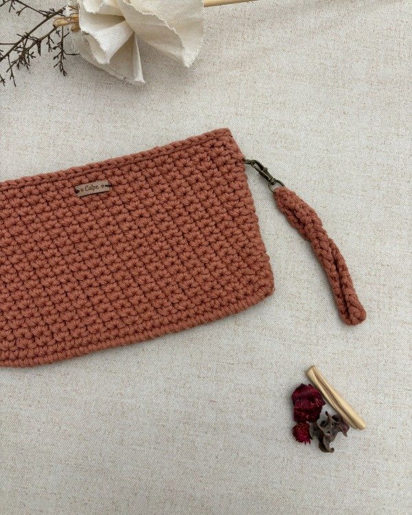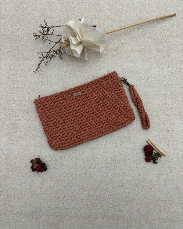 Tejido a mano en hilo de algodón, con correa tejida con mosquetón y cierre para mayor seguridad.