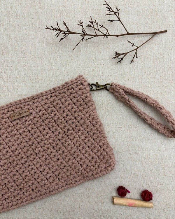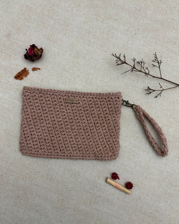Tejido a mano en hilo de algodón, con correa tejida con mosquetón y cierre para mayor seguridad.